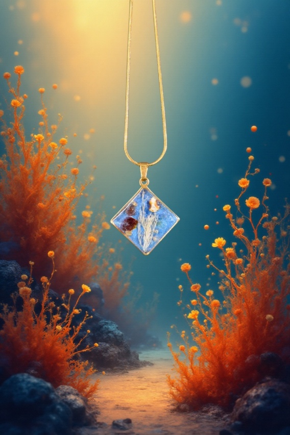 Artystyczny naszyjnik inspirowany podwodnym światem. Rośliny wodne i fragmenty bursztynu zanurzone w błękicie tworzą spokojną, organiczną kompozycję. 🌊🌿✨