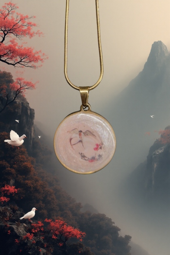 W okrągłym wisiorku zamknięty został ptak w locie, unoszący się nad delikatnymi kwiatami – motyw inspirowany japońską estetyką, w której natura i cisza mają głęboki sens.