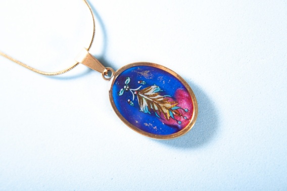 Centralnym motywem jest pióro w kolorystyce biało-złoto-niebieskiej 🪶 – symbol ochrony, intuicji i wolności. Całość delikatnie oprószona jest złotą miką, która tworzy efekt subtelnego brokatu, pięknie odbijającego światło i podkreślającego artystyczny charakter naszyjnika ✨.