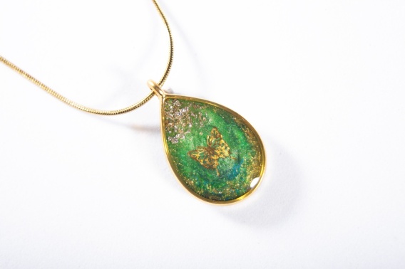 Medalion w kształcie łezki wypełniony jest zielonym tłem, wzbogaconym drobinkami złota, które nadają całości świeżości i naturalnej energii 🌿. W kompozycji pojawiają się również srebrne akcenty oraz złota mika, subtelnie odbijające światło i podkreślające artystyczny charakter biżuterii.