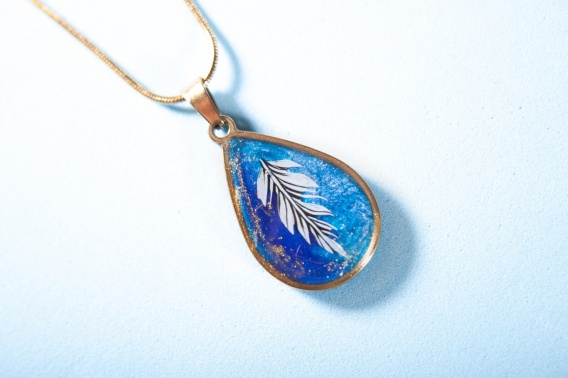 Medalion w kształcie łezki łączy dwie kontrastujące powierzchnie: z lewej strony matowy granat, z prawej perłowy niebieski, tworząc efekt przejścia między ciszą nocy a spokojem światła 💙. Granatowa część została delikatnie oprószona złotą miką, która dodaje całości subtelnego, eleganckiego połysku ✨.