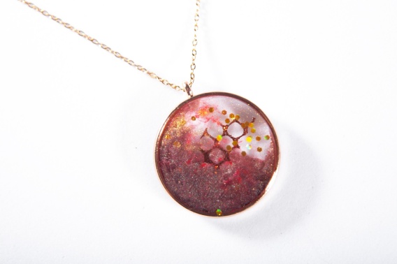 Naszyjnik jest dwustronny. Z jednej strony motyw wygląda jakby był ukryty za chmurami, delikatny i półprzezroczysty, z drugiej – jakby znajdował się w samym ich wnętrzu, bardziej nasycony światłem i brokatowym blaskiem. Dzięki temu biżuteria zmienia swój charakter w zależności od strony i oświetlenia.