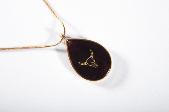 Medalion w kształcie łezki posiada matowe, czarne wykończenie – zarówno z przodu, jak i z tyłu. Głęboka czerń stanowi idealne tło dla centralnego motywu: złotego byka z dużymi, rozłożystymi rogami, który przyciąga uwagę i nadaje całości mocny, totemiczny charakter.