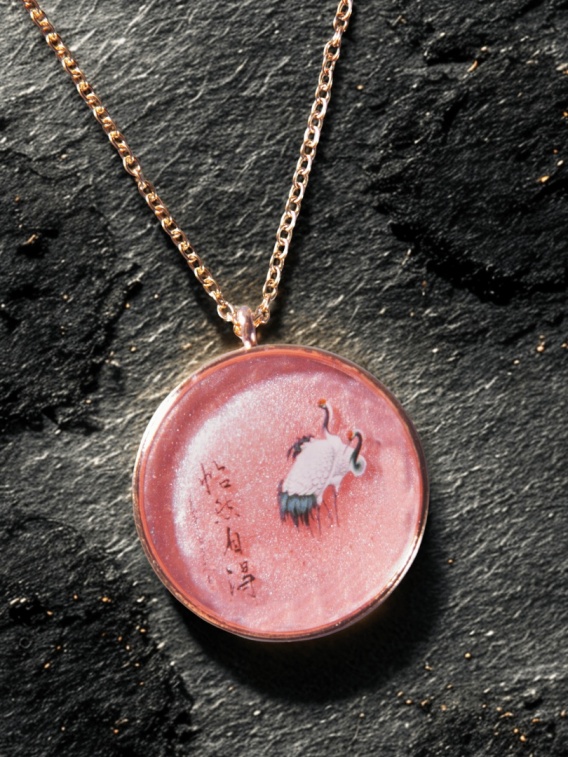 Okrągły medalion posiada perłowo-różowe tło, delikatnie połyskujące na biało, które nadaje całości lekkości i szlachetnego charakteru. Po prawej stronie medalionu znajdują się dwa żurawie w kolorystyce biało-czarnej z charakterystycznymi czerwonymi akcentami na głowach – symbole długowieczności, harmonii i wierności w kulturze Dalekiego Wschodu.