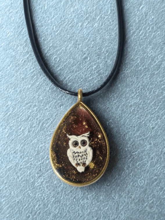 Artystyczny naszyjnik z motywem białej sowy na ciemnym, złocistym tle 🦉✨
