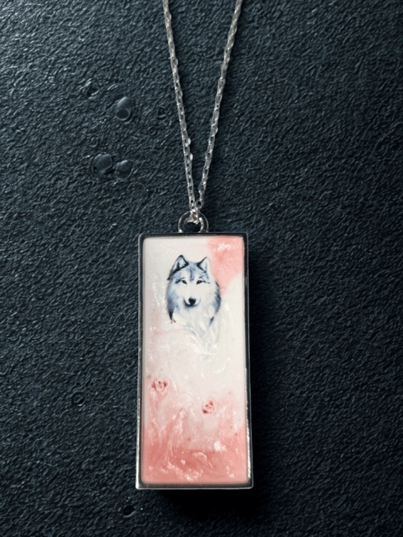 Centralnym motywem jest szary wilk, wyłaniający się z delikatnej, mleczno-różowej mgły. Stonowana kolorystyka nadaje całości spokojny, lekko mistyczny charakter, a subtelne drobinki światła sprawiają, że powierzchnia wisiorka delikatnie reaguje na ruch i światło.