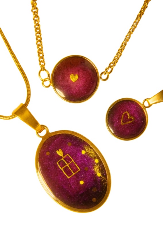 Zestaw „Złote Serce Nocy” 💗✨ – trzy delikatne, ręcznie wykonane elementy: duży owalny naszyjnik, długi naszyjnik 60 cm oraz bransoletka z medalionem. Żywica UV w odcieniach różu przechodzącego w czerń, złote motywy serca i pozłacana stal tworzą elegancki, zmysłowy komplet.